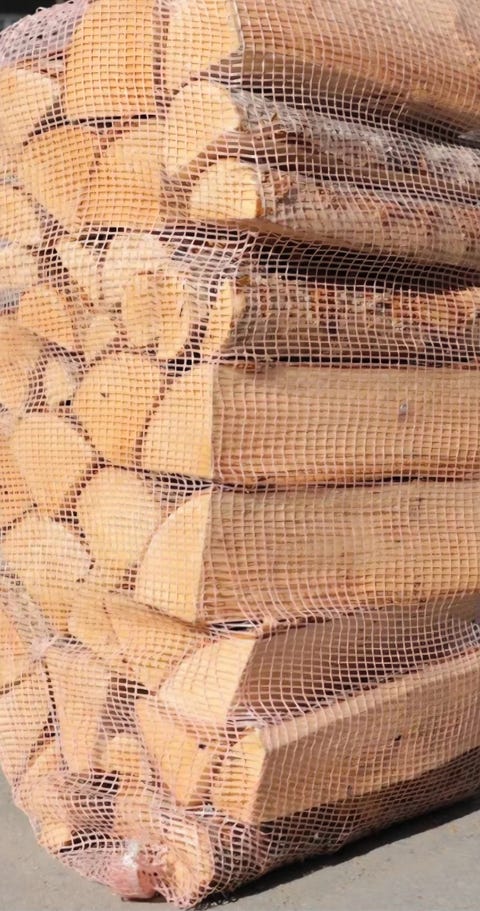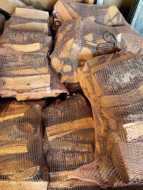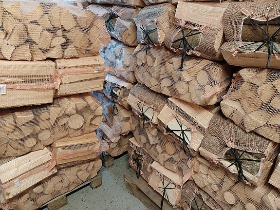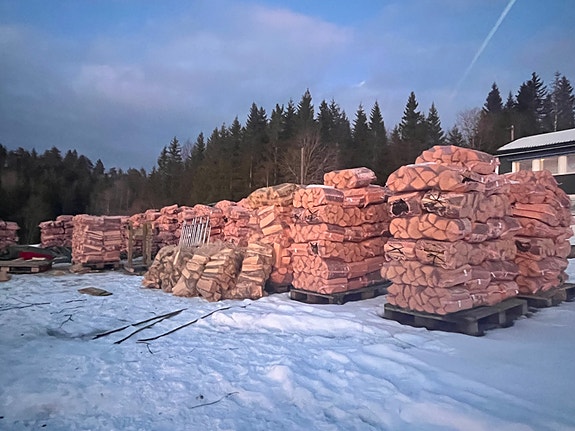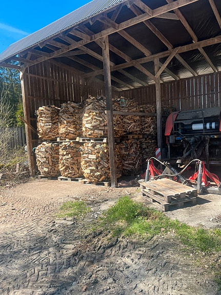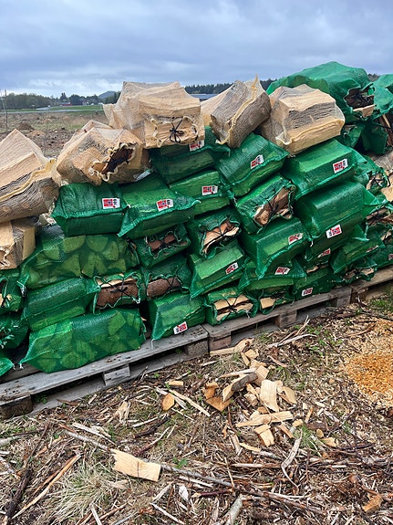 Ved i storsekk på pall