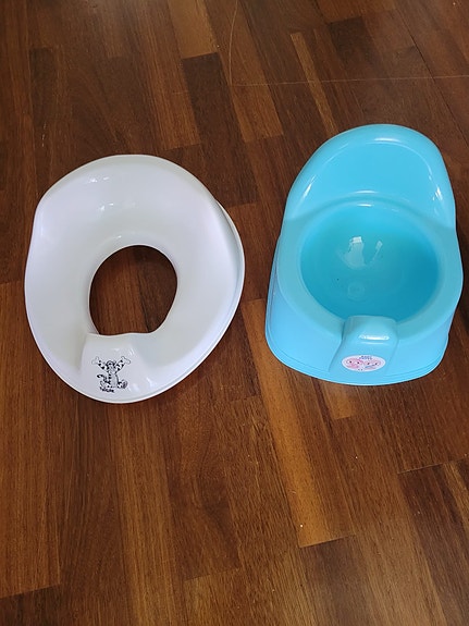 Blå potte og hvit toalettsete-ring til barn