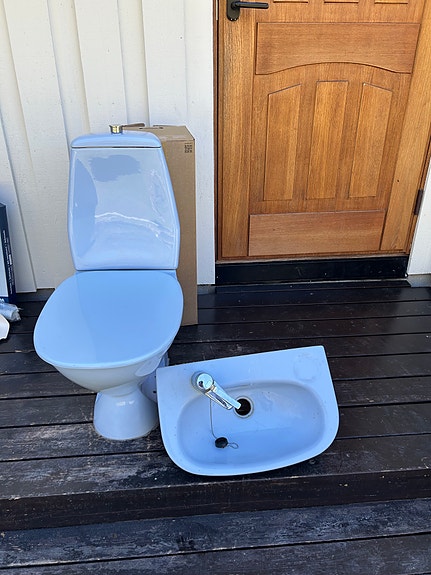 Lyseblått toalett og servant med armatur