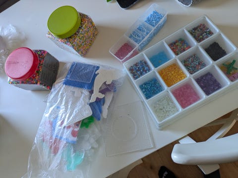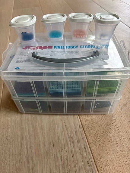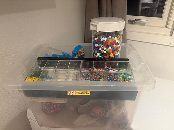 Hama og andre perler i stor eske. Oppbevaringsbokser for sortering