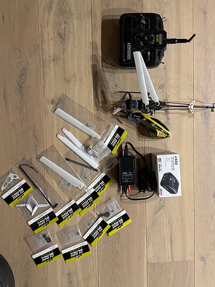 Blade LP6DSM fjernkontroll og SkyRC E430 batterilader + helikopter og deler