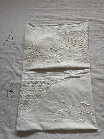Redesign? Håndarbeid. Sett med 2 gamle putevar med hardangersøm og monogram