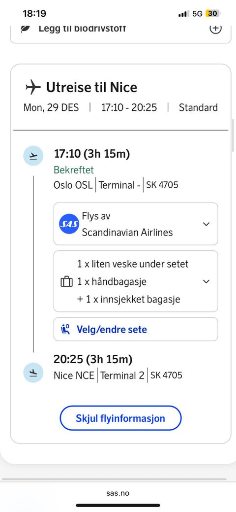 Flybilett fra Oslo til Nice 29.12