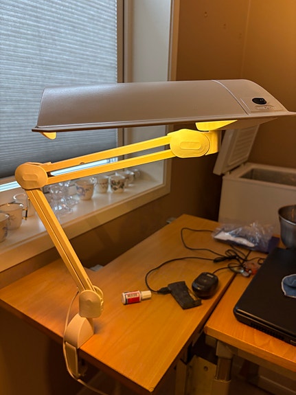 Ergonomisk hev- og senk-skrivebord og grått understell