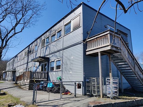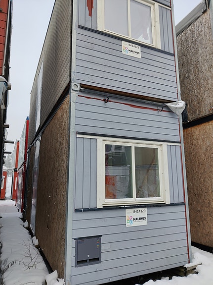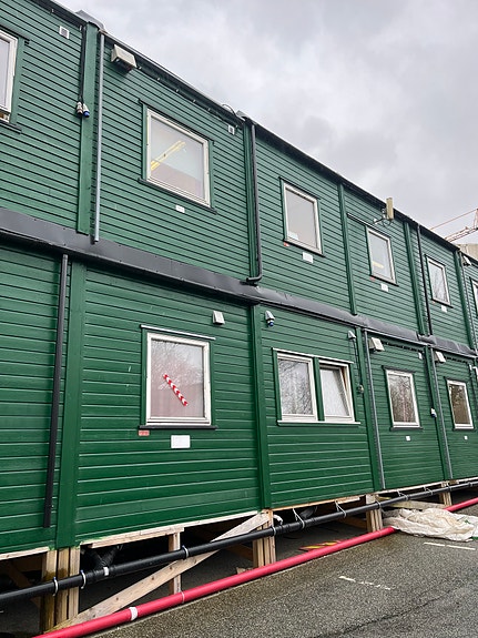 Brakke / modulbygg med vindu på begge sider og stålramme under 2 ståldører.