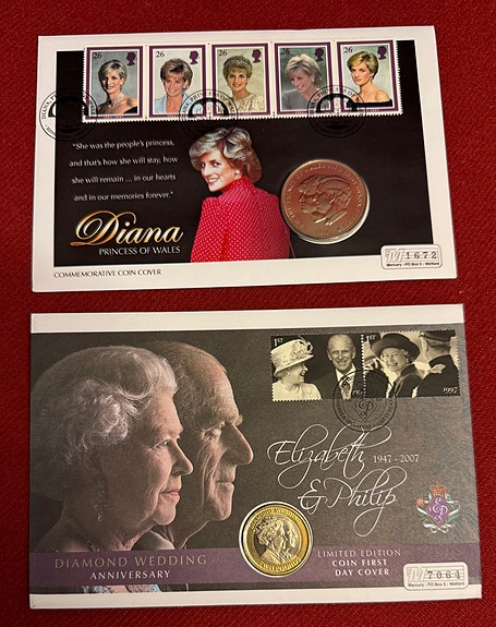 To kongelige myntbrev med dronning Elizabeth II og prinsesse Diana