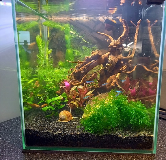 Akvarium med svart topp og innredning