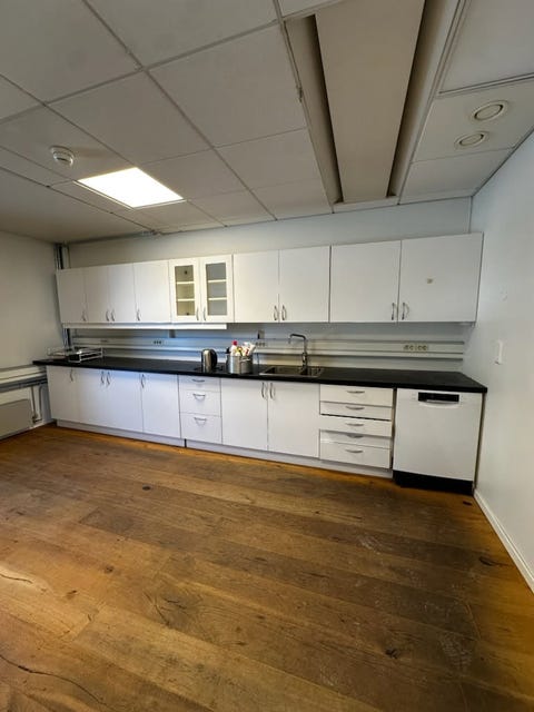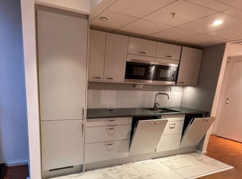 Lyst kjøkken med skap, benkeplate og hvitevarer