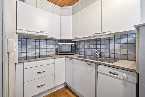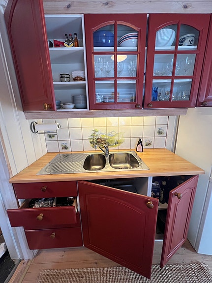 Hyttekjøkken med overskap, underskap, benkeplate og vask