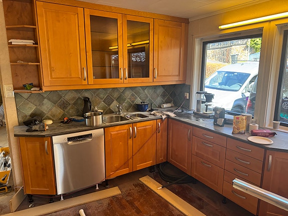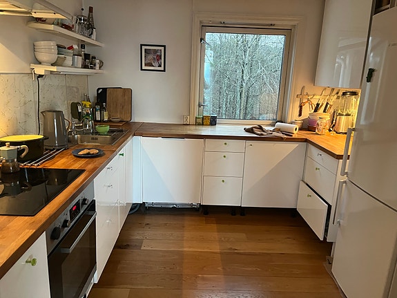 Hvitevarer + benkeplate i tre + kjøkken