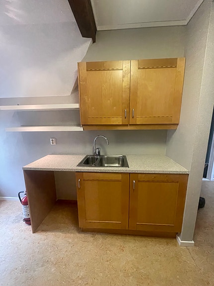 Lite kjøkken med skap, benkeplate og vask