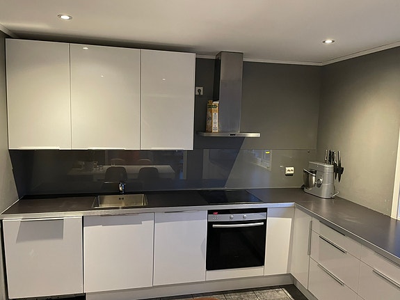 Hvitt kjøkken med skap, benkeplate og integrert platetopp