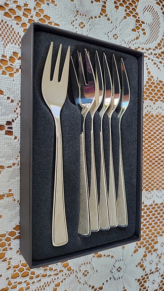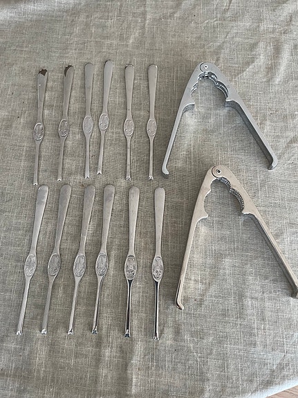 6 skalldyrgafler og knekker fra Hadeland Bestikk