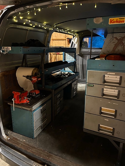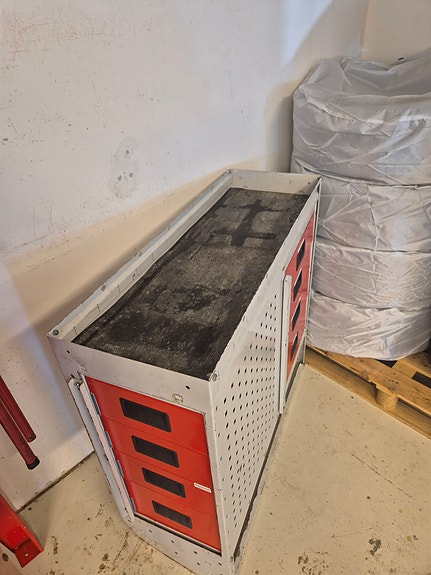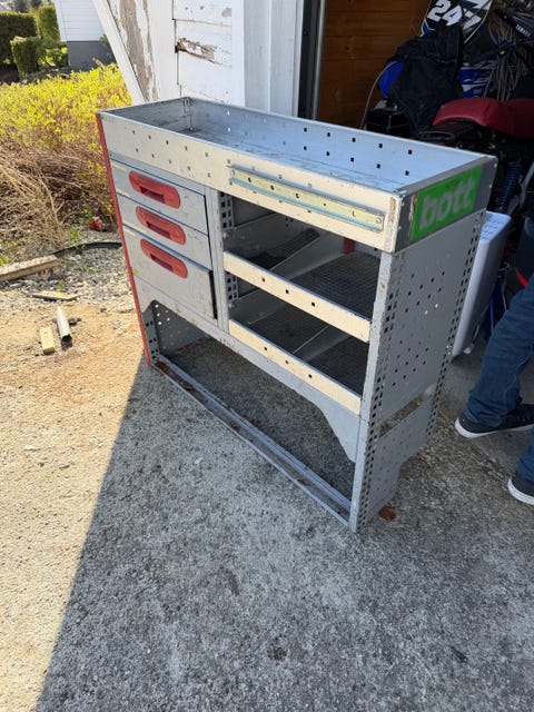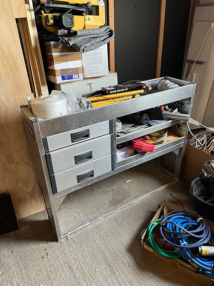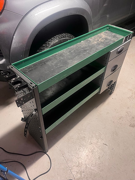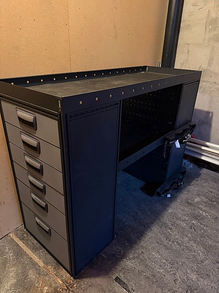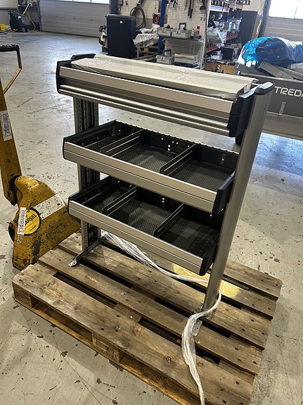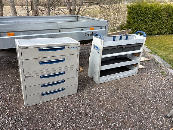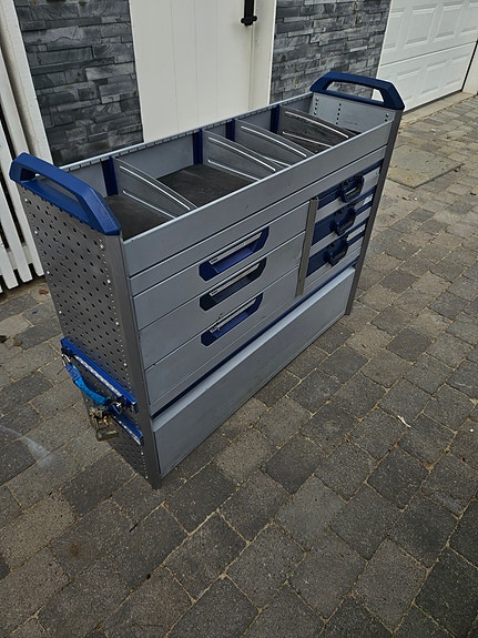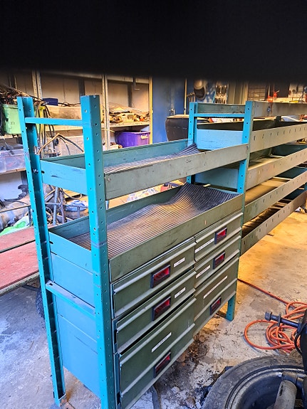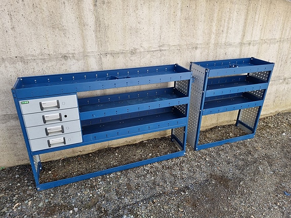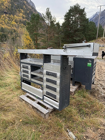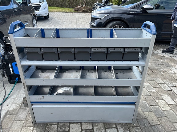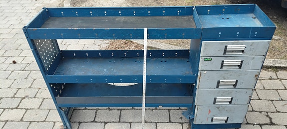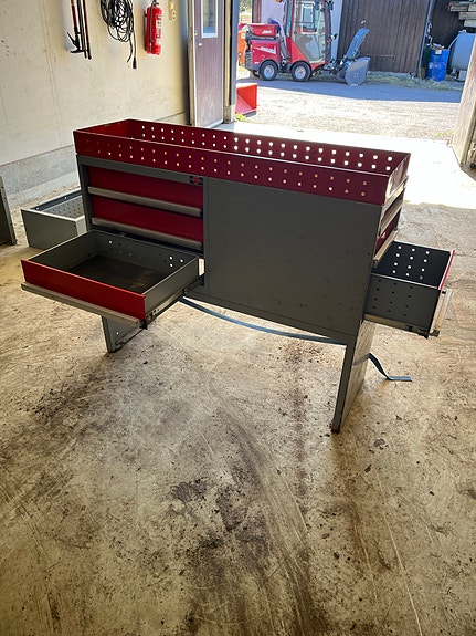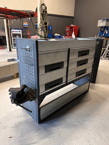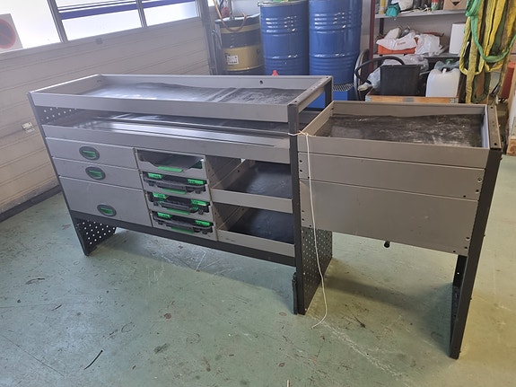 Bott bilinnredning, verktøyreol med skuffer og hyller