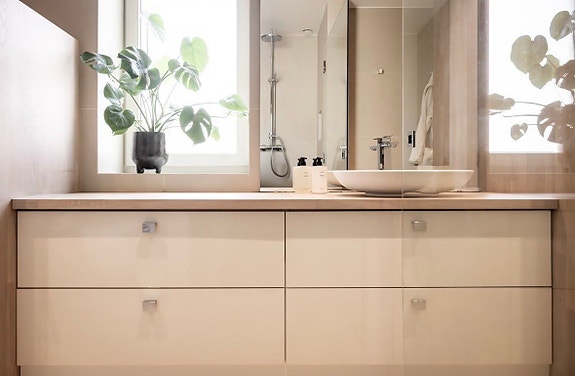 Baderomsinnredning i bjørk med dobbel vask og blandebatteri