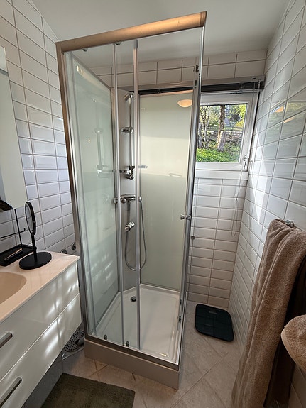 Dusjkabinett med skyvedører og blandebatteri