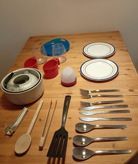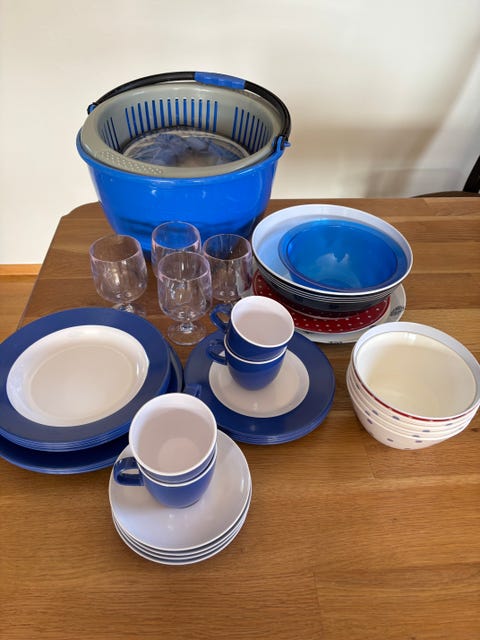 Servise og kjøkkenutstyr til camping i blått og hvitt