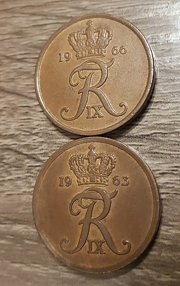 2x Danske 5 Øre 1963 & 1966 selges samlet