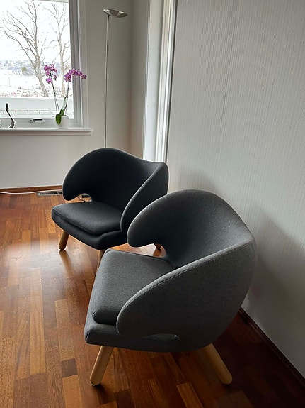NY PRIS: Lenestol grå tekstil som ligner Finn Juhls PELIKAN.