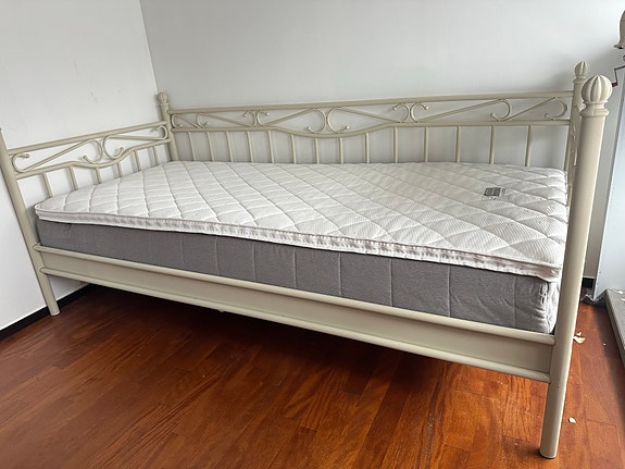 Fin og lite brukt daybed/seng i lyst metall, med madrass og overmadrass