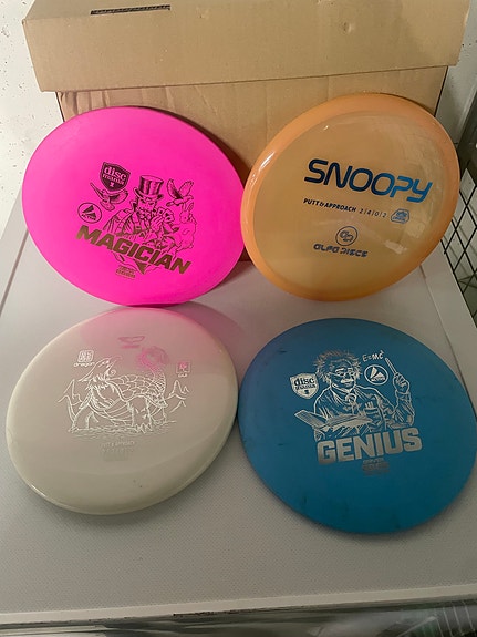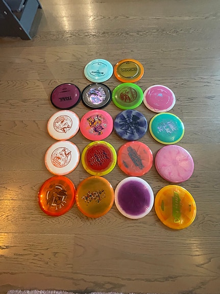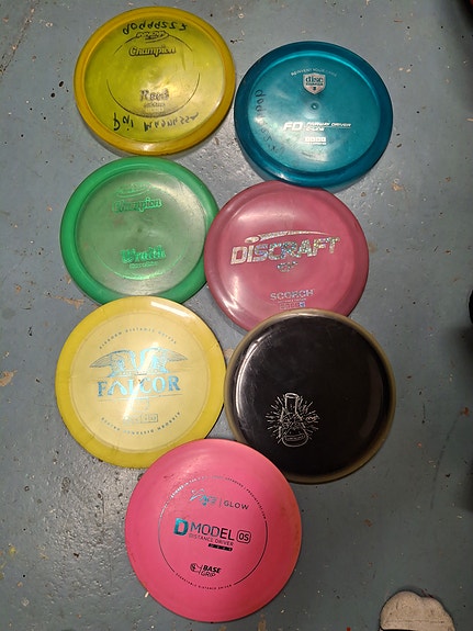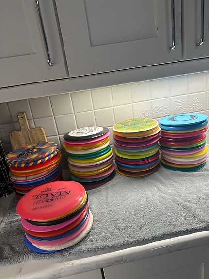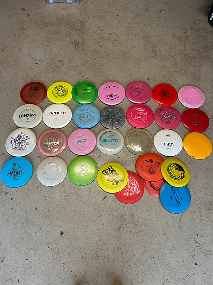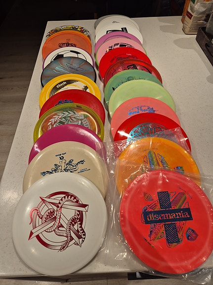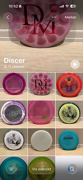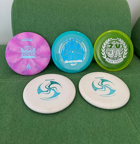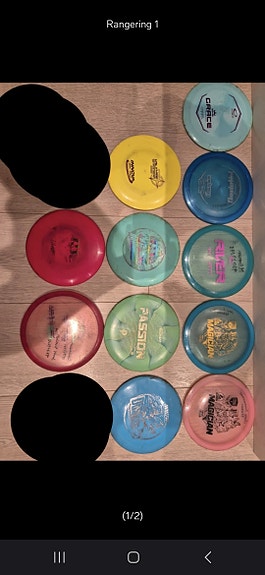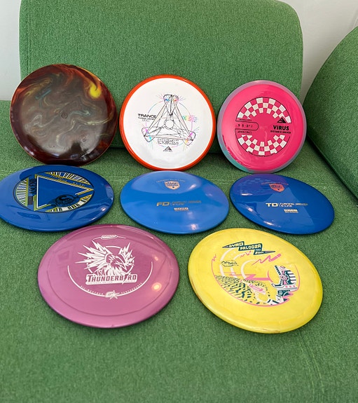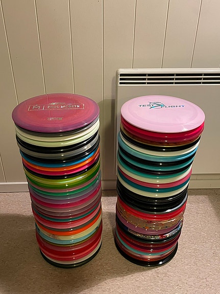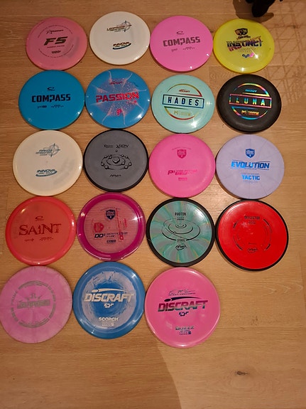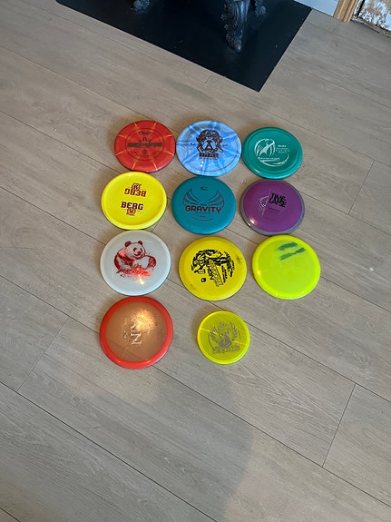 Mange ulike discgolf disker til salgs