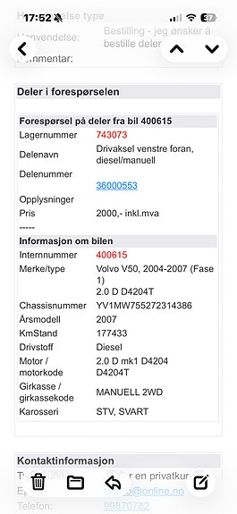 Volvo V50 drivaksel venstre foran 2.0D 2004–2007