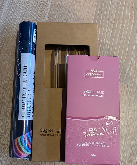 Nye glass sugerør, Dubai sjokolade og armbånd.