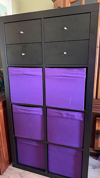 Expedit (nå kallax) hylle med innsatser og bokser