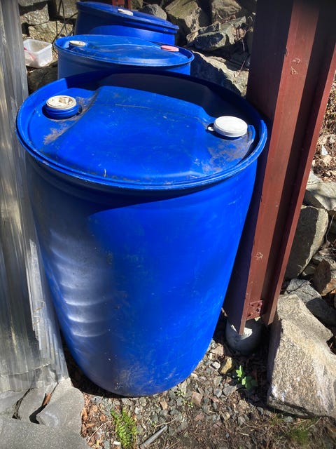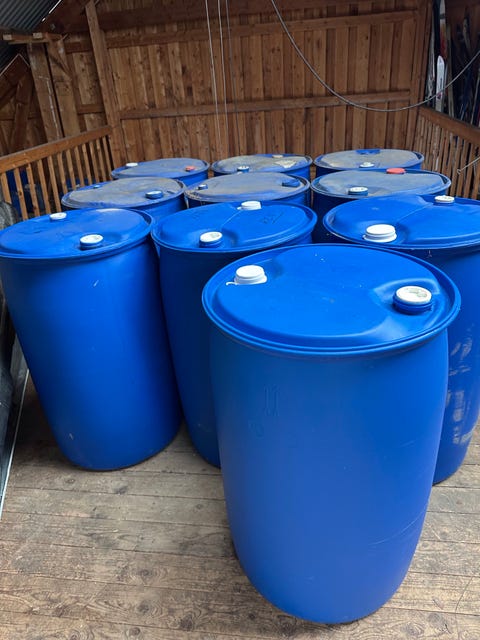 Blå plasttønner/plastfat - 7 stk. Til lagring, flytebrygge, badebrygge m.m.