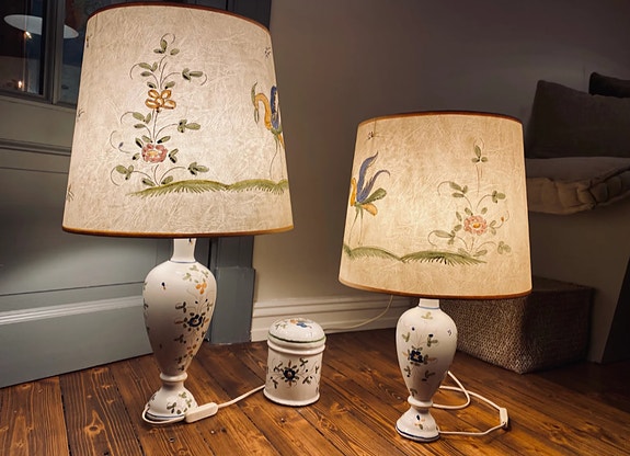 Nydelig fransk håndmalt keramikk sett med lamper, skål og annet