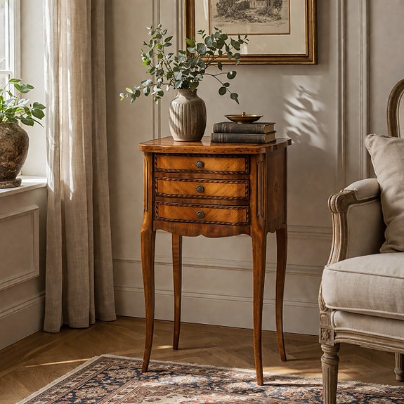 Vakkert antikk sidebord i fransk stil med intarsia . Nattbord