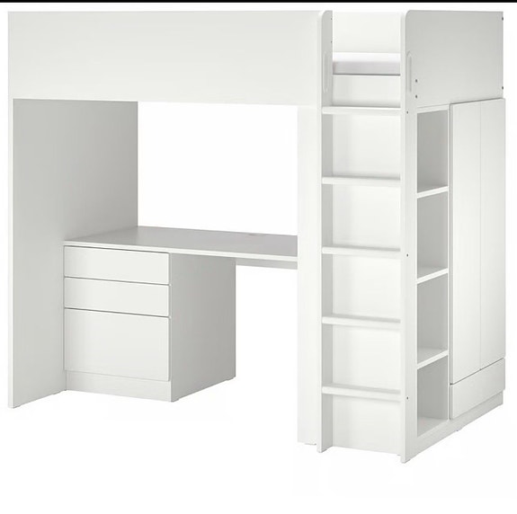 IKEA hvit høyseng med skrivebord, garderobe og hyller