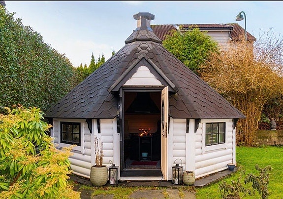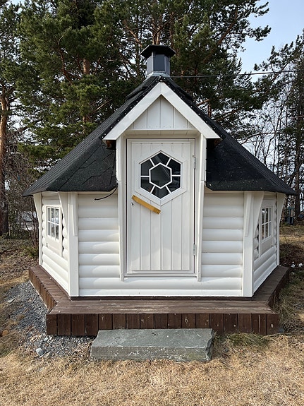 Grillhytte sekskantet tre hvit fasade med grill og pipe