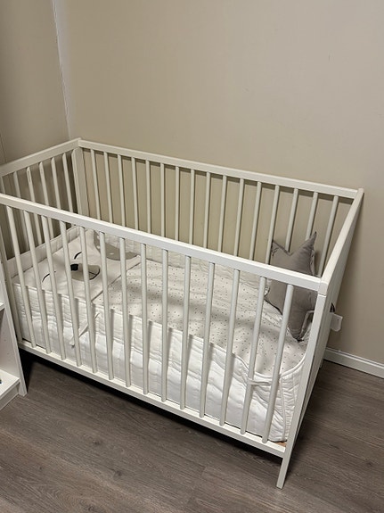 IKEA Gulliver sprinkelseng 60x120 hvit og Krummelur madrass med tilbehør