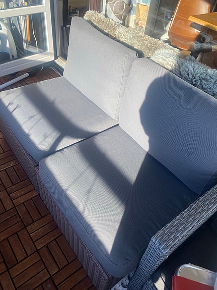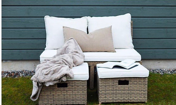 Hage-/balkongsofa i kunstrotting med fotskammel og hvite puter