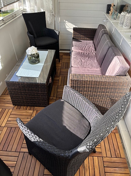 Hage-/balkongmøbler i rotting med sofa, stoler og bord