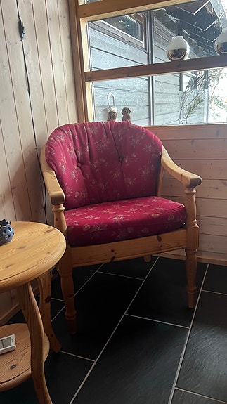 Kvalitets stol i heltre med typisk hytte mønster. Fremstår som relativt ny