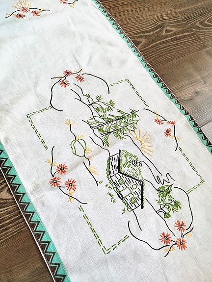 Vintage brodert løper/duk - hytte i skogen-motiv