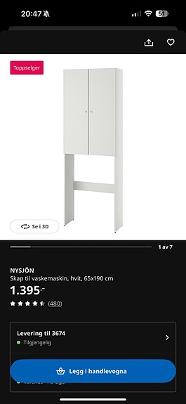 IKEA Nysjön skap til vaskemaskin 65x190 cm hvit