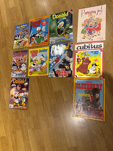 Blandet lot tegneserieblader og bøker Donald Duck Cubitus Blueberry Prøysens jul