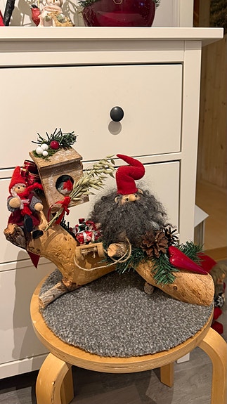 Flott juledekorasjon med nisser kjelke dompap nek julegaver m.m
