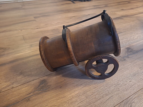 Vinflaskeholder formet som en kanon i tre og metall