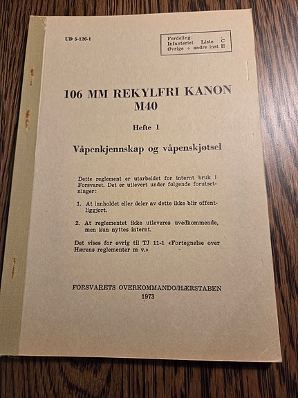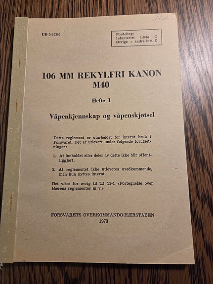 Forsvaret 106 mm rekylfri kanon M40 hefte 1 våpenkjennskap og våpenkjøtsel