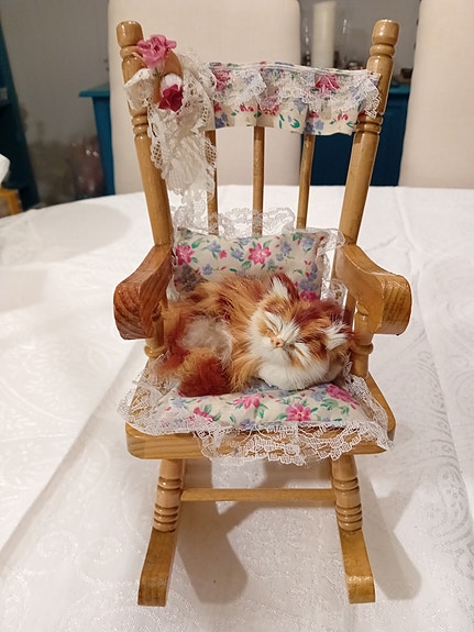 Liten kattunge koser seg i bestemors gyngestol