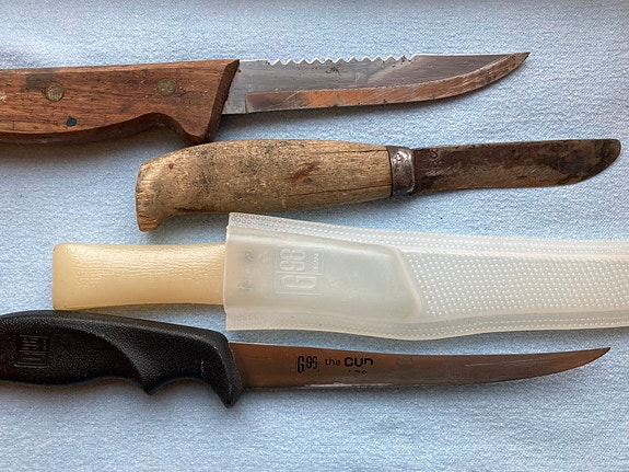 KJ Mora fiskekniv / jaktkniv, Geilo tollekniv og G96 Brand fileteringskniv