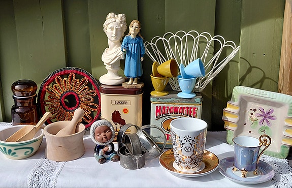 Retro kj. utstyr, figurer, met.bokser, Sawa kakepr. m.m. Loppispriser