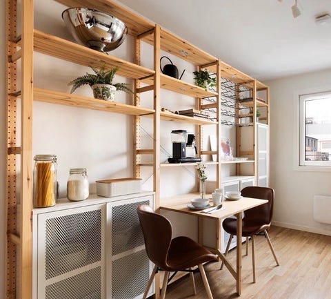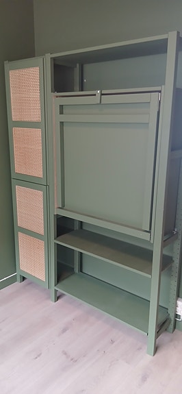 4 seksjoner IVAR hyllene IKEA, med 3 hvit skaper, vinhyller og klaffebord