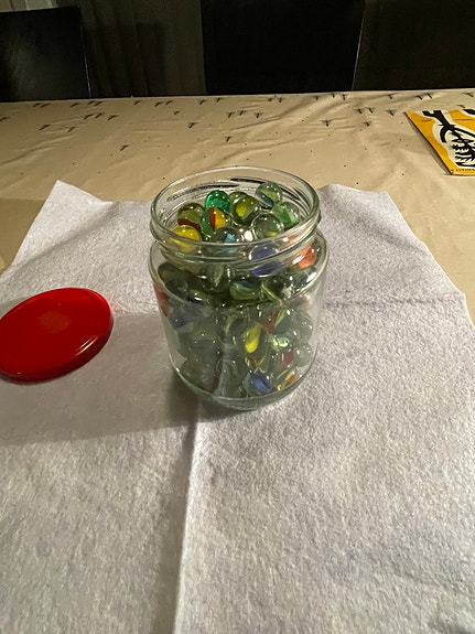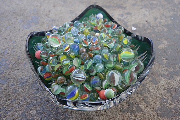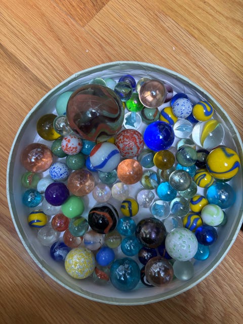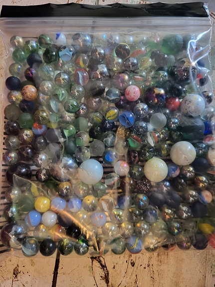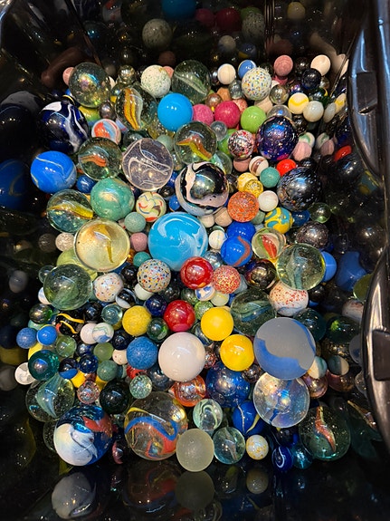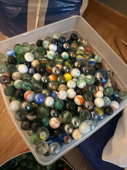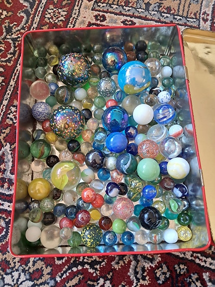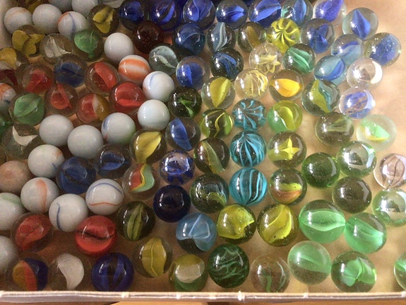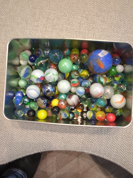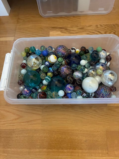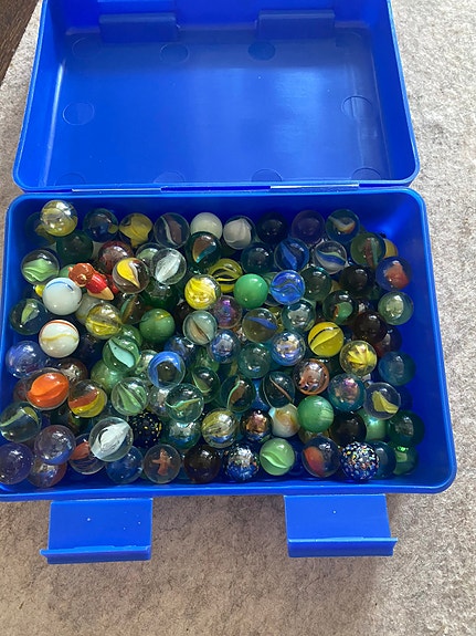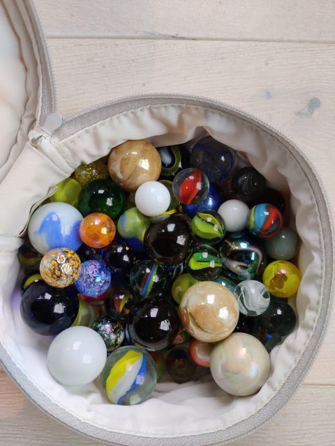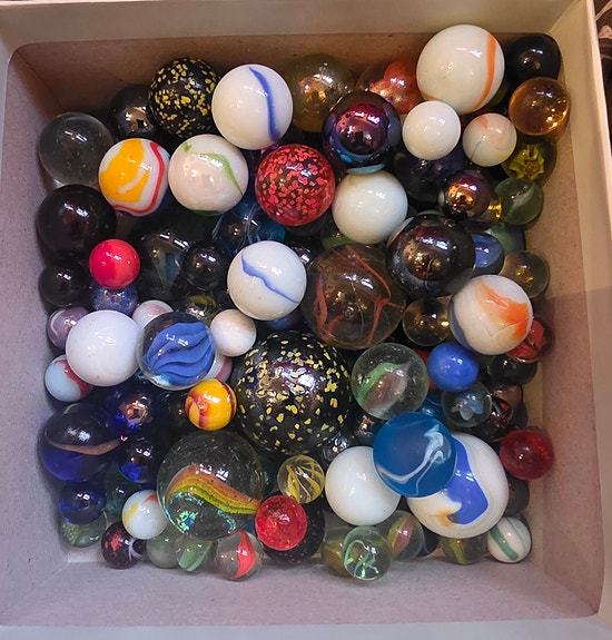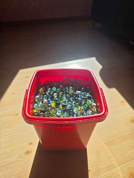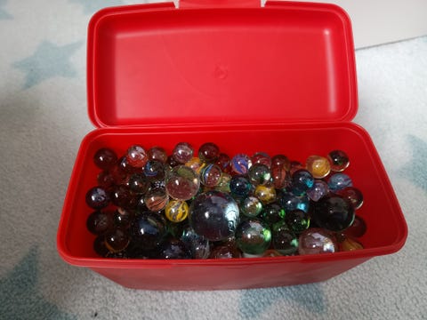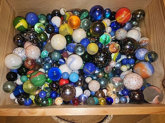 Flere hundre klinkekuler i en liten kiste, store og små