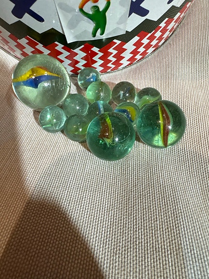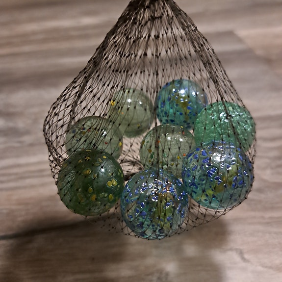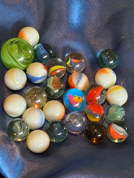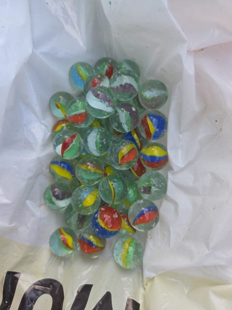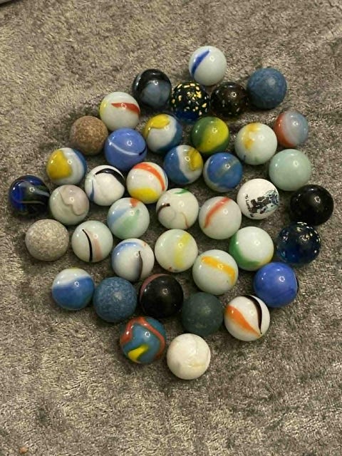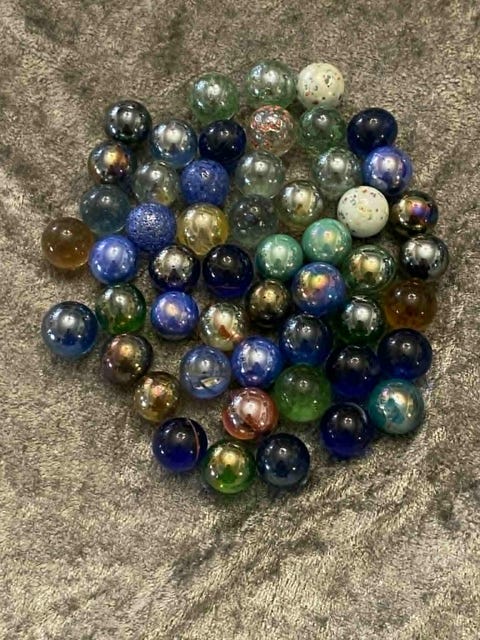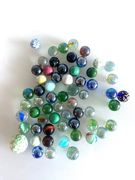 63 stk fine gamle klinkekuler – blandede farger og mønstre