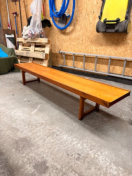 Krobobenk i teak, designet av Torbjørn Afdal for Bruksbo